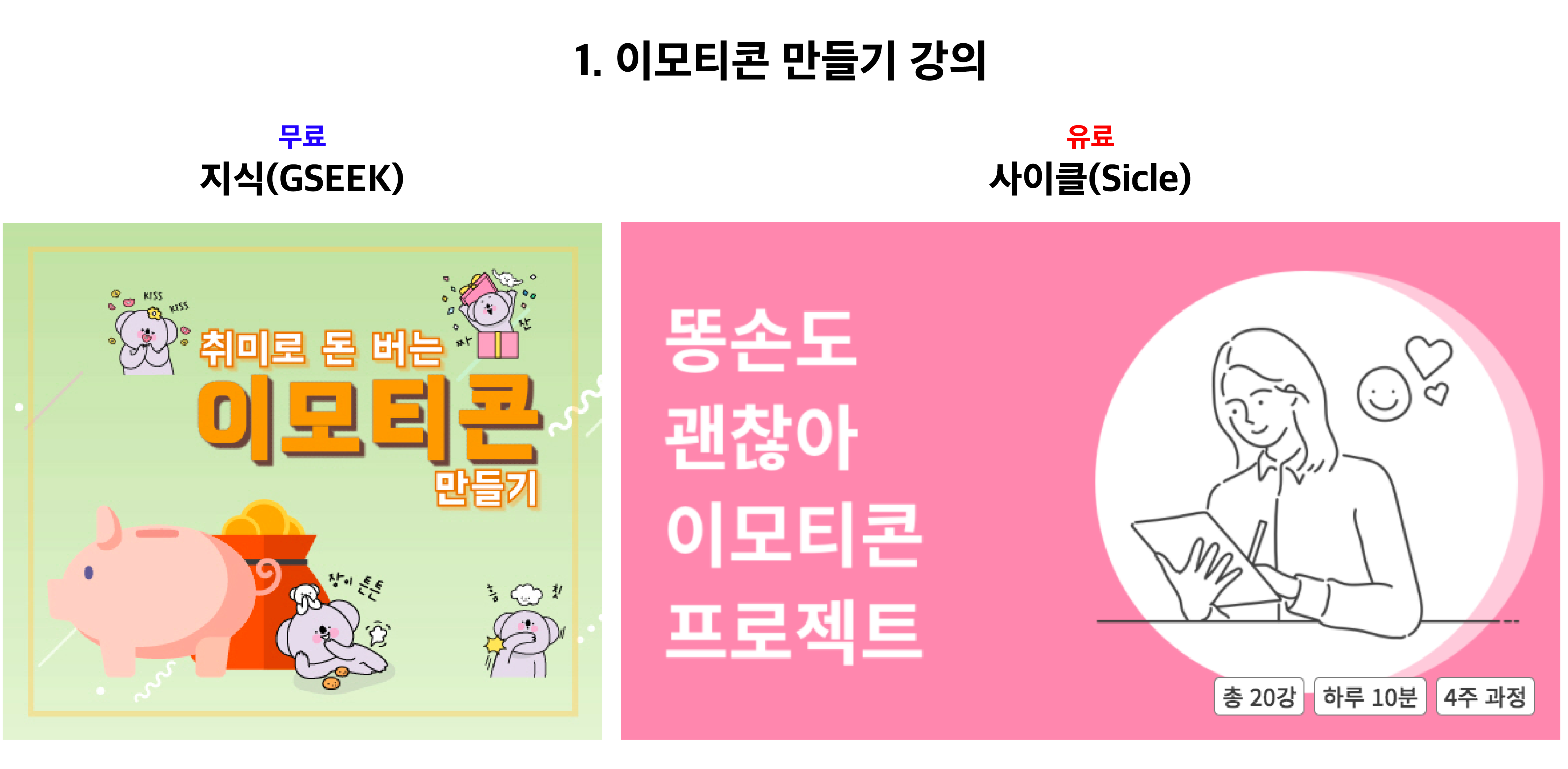 첫 번째는 이모티콘 만들기 강의입니다. 카카오 이모티콘 스튜디오에서 누구에게나 이모티콘 제안을 열어놓았기 때문에 자신만의 이모티콘을 만들어 제안 후 채택되면 출시됨과 동시에 수익창출의 기회를 제공하고 있습니다. 두 개의 강의에서 공통적으로 제공하는 강의 내용은 '프로크리에이트' 강의입니다. 프로크리에이트란 태블릿PC로 디지털드로잉 서비스를 제공하는 어플리케이션입니다. 어도비 포토샵과 비슷한 기능도 갖추고 있어 여러모로 활용도가 높은 어플입니다. 두 강의가 나만의 이모티콘 기획, 프로크리에이트를 활용한 이모티콘 제작 방법, 이모티콘 제안하기의 순서로 강의가 진행됩니다.