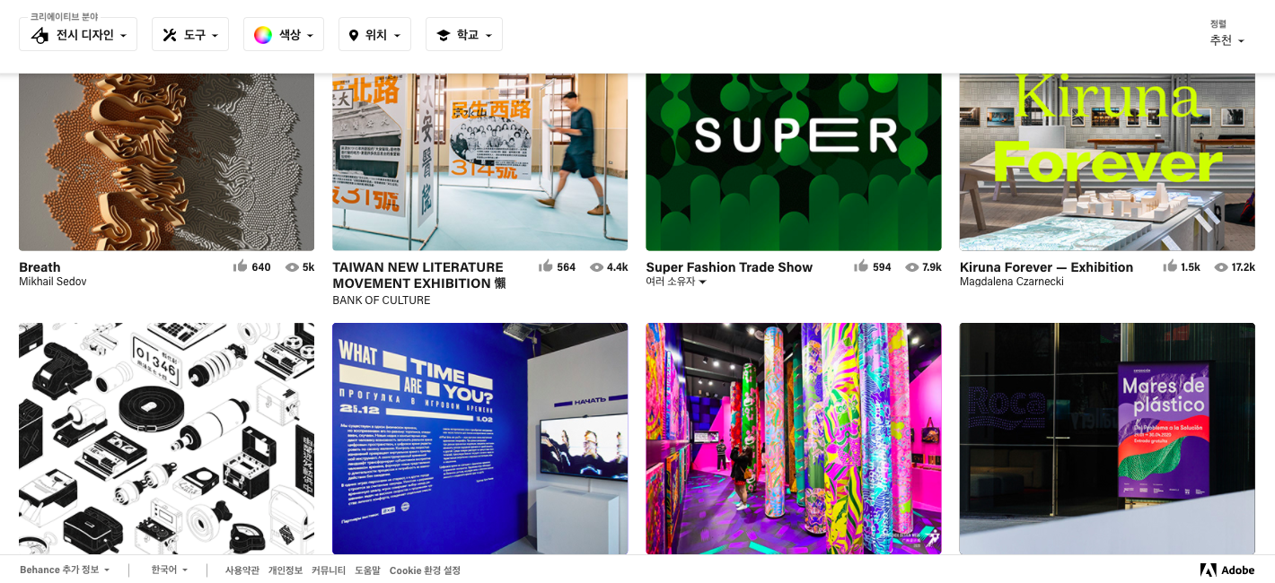 전시기획자인 저에게 비핸스가 최고인 이유는 전시디자인 카테고리가 따로 있다는 점입니다. 카테고리에 들어가면 최신 전시디자인의 공간 디자인, 그래픽 디자인, 영상 콘텐츠 등 편리하게 확인할 수 있어 기획 시에 정말 큰 도움이 됩니다.