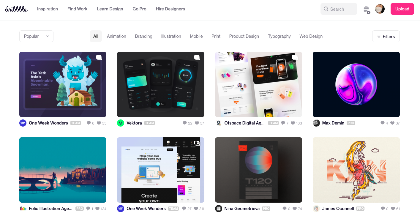 드리블은 디지털 디자이너들의 자체 프로모션 및 SNS 플랫폼입니다. 디자인 포트폴리오 확인, 디자이너 채용 등이 가능합니다. 카테고리는 애니메이션, 브랜딩, 일러스트레이션, 모바일, 프린트, 프로덕트 디자인, 타이포그래피, 웹디자인으로 나누어져 있습니다. 각 분야별 그래픽 디자인을 확인할 수 있는 사이트 입니다.