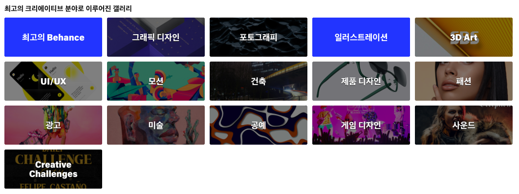 비핸스에서 볼 수 있는 카테고리는 드리블과 비교했을 때 훨씬 다양합니다. 그래픽 디자인, 포토그래피, 모션그래픽, 건축, 제품 디자인 등등 정말 다양한 업계의 디자인을 확인할 수 있다는 장점이 있습니다.