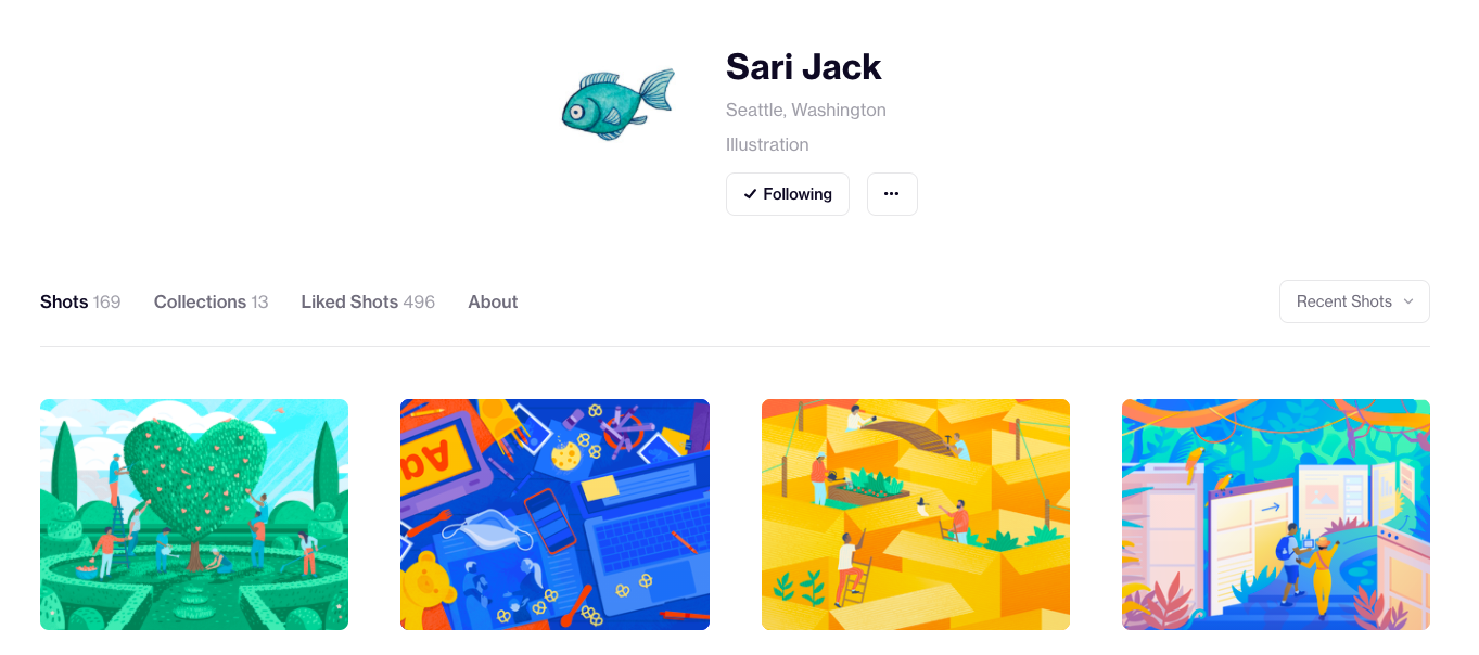 일러스트레이션 디자이너 새리 잭입니다. 저는 일러스트레이션을 볼 때 색조합의 안정감을 많이 보는 편입니다. 그리고 채도가 높은 일러스트레이션을 좋아합니다. 이 디자이너는 컬러 조합에 있어 아주 뛰어난 능력을 가지고 있습니다. 보기만 해도 눈이 즐거운 그림들로 포트폴리오가 가득 차 있습니다.