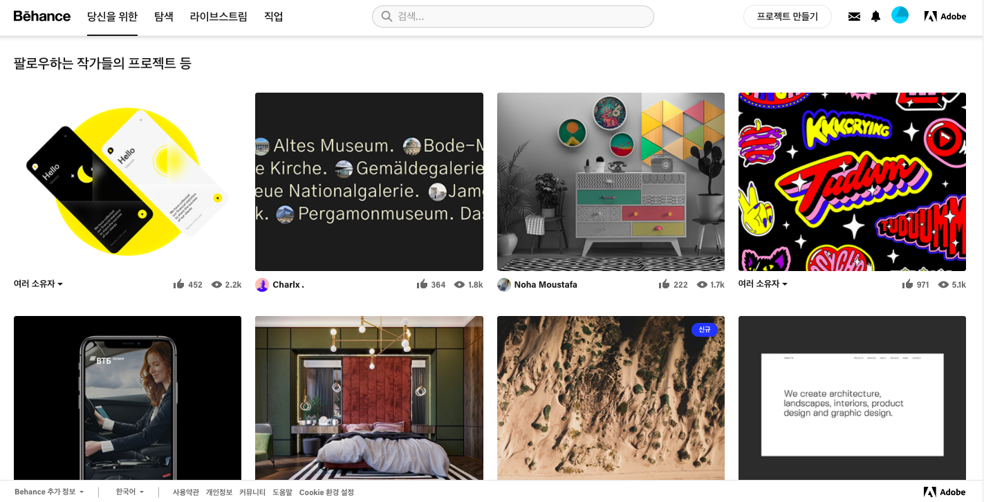 오늘은 제가 평소에 최신 디자인 스타일, 동향 등을 확인하는 디자이너 포트폴리오 플랫폼을 공유하려 합니다. 전시 기획안을 작성할 때 최신 전시관 공간디자인 현황 등을 분석하거나, 전시관 디자인 콘셉트를 정의하는 페이지는 필수로 들어갑니다. 그래서 저는 요즘 유행하는 공간, 그래픽 디자인을 수시로 확인하는 편입니다. 오늘 소개할 두 가지 사이트에는 전 세계 디자이너들이 자신의 작품을 업로드하여 홍보하고 공유하는 활동들을 확인할 수 있습니다. 보고 있다 보면 멋진 디자인들이 쏟아진다고 느낄 정도랍니다.