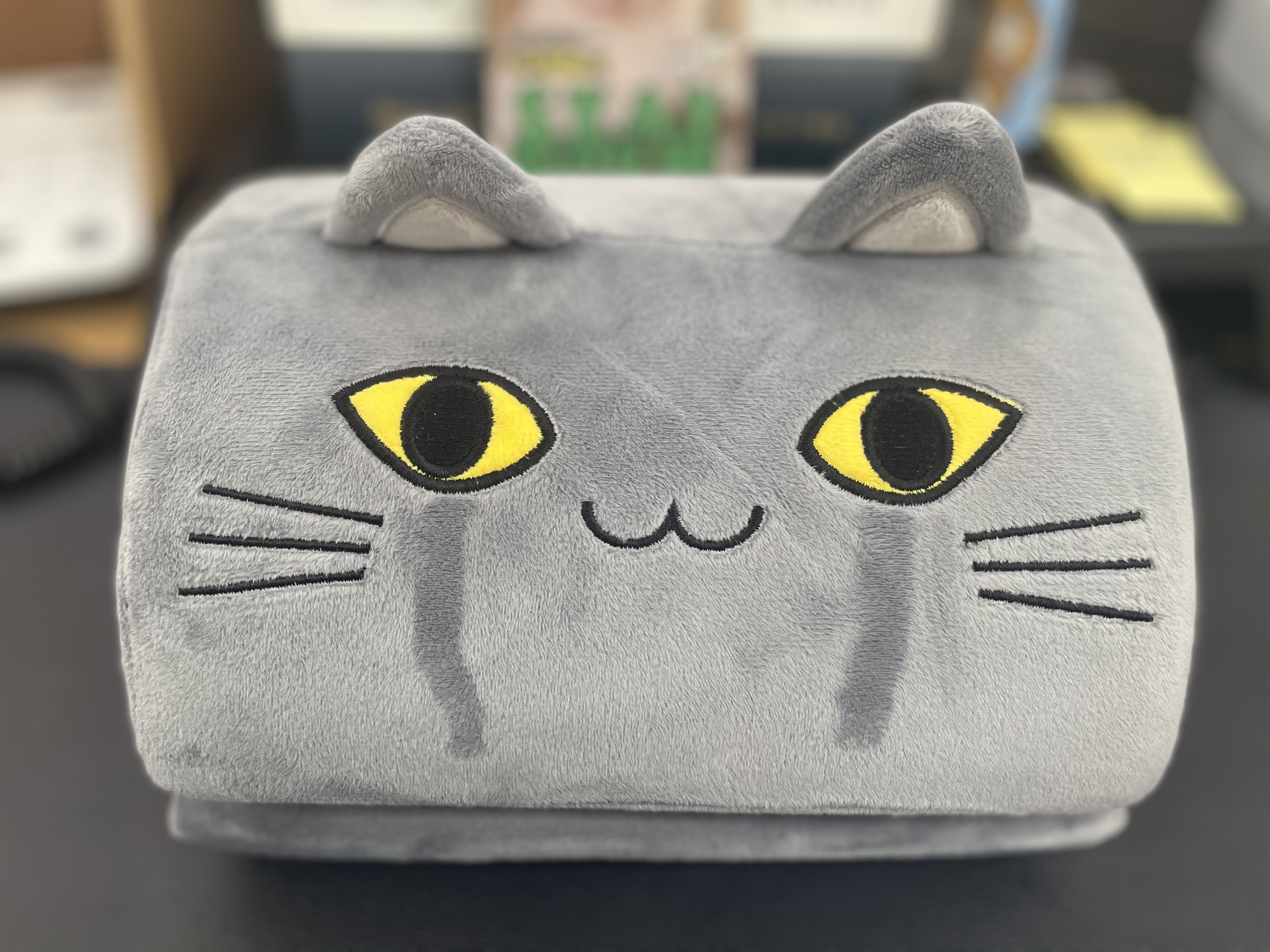 사용방법은 이미지와 같이 인형에 있는 홈에 책상을 끼워 넣고 쿠션을 배에 받혀 사용하는 것입니다. 등이 의자에 알맞게 고정되면서 안정감이 느껴집니다. 인형 표면이 부들부들해서 보온효과도 있는 느낌입니다.